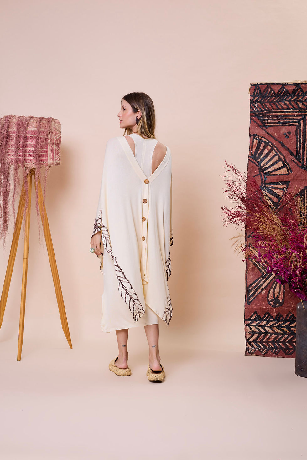 Cada etapa do processo é cuidadosamente pensada, desde a escolha da matéria prima, passando pela coloração natural, até o corte milimetricamente calculado para não gerar desperdício de tecido.